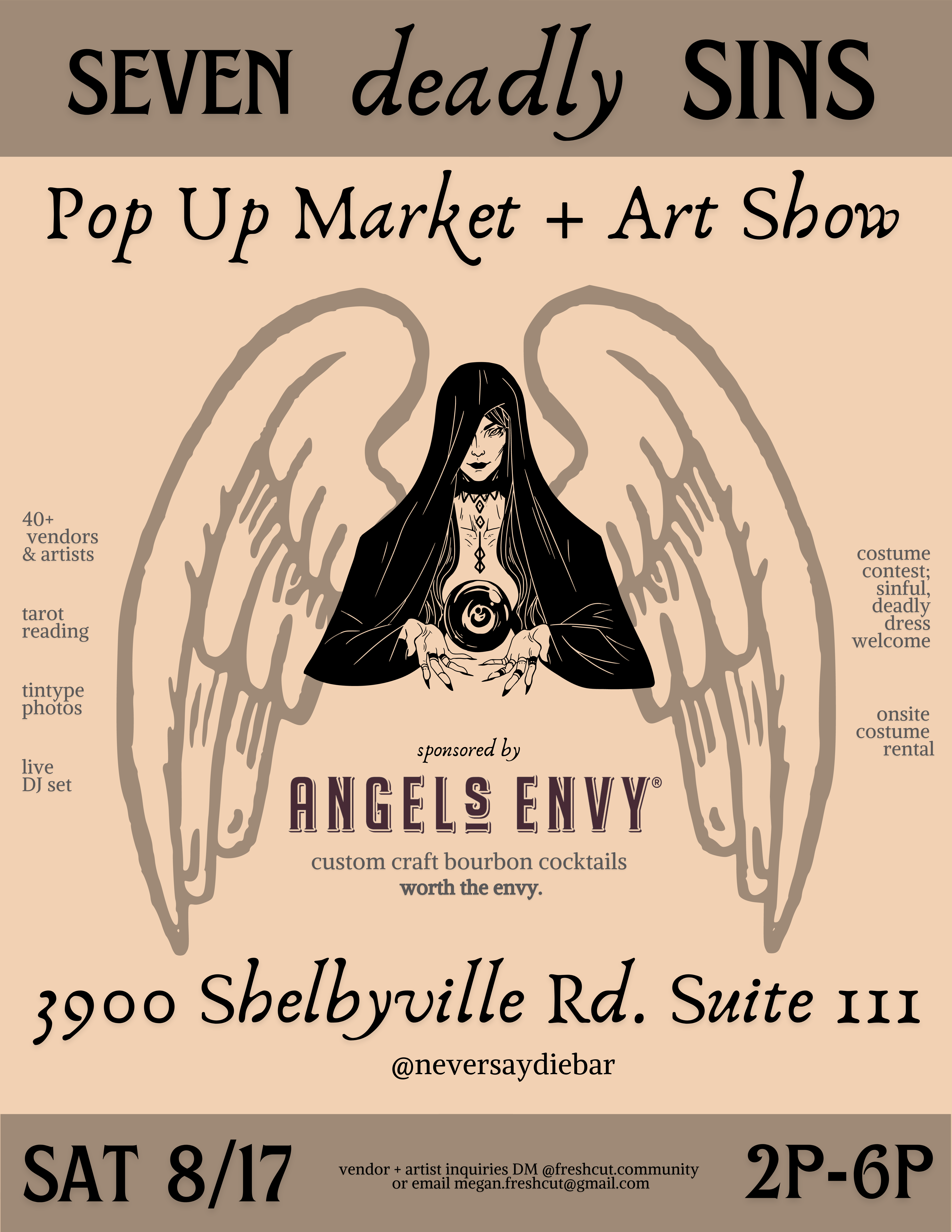 Freshcut Community partners with Never Say Die Bar, in St. Matthews, to host the SEVEN DEADLY SINS indoor popup market and art show.